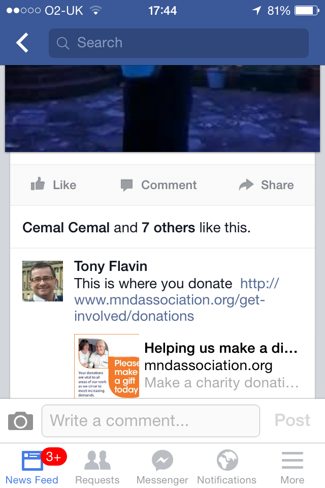On Tuesday morning I woke up to a Facebook post from my cousin Jack asking me to accept the challenge. My initial reaction was to say “I’m going away, I won’t have time” but that’s not like me so I did it, all by myself at 6am in the morning. I posted the video on Facebook, challenged three chaps to do the same and added a link to the MND association donation page on their website.